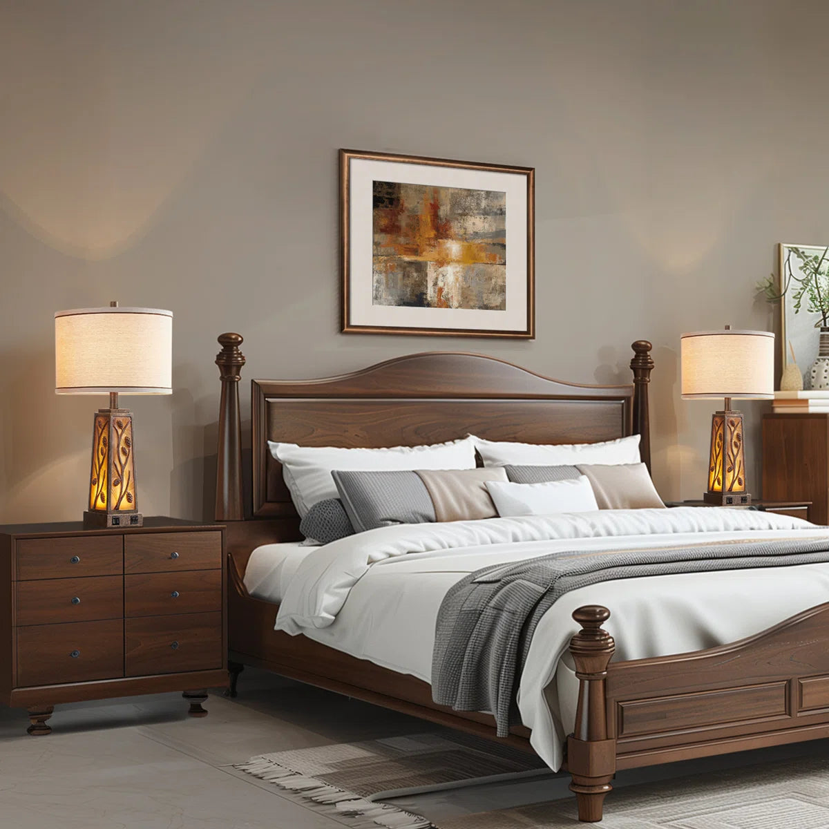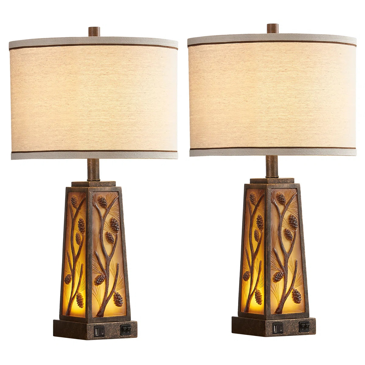 This lamp set is made of hand-craft amber-colored resin with a pine cone pattern. It is a superb choice for your living space. LED bulbs are included for both lights. The night light has an independent switch. Built-in 5V 2.1A USB ports. The night light is placed in the middle of resin which makes the light soft and cozy at night. Such a design helps protect your eyes and also is convenient to use. It is a perfect match for multiple house decor styles, such as farmhouse, gothic, country, and transitional styles. It gives your room a warm, romantic, and cozy feeling.